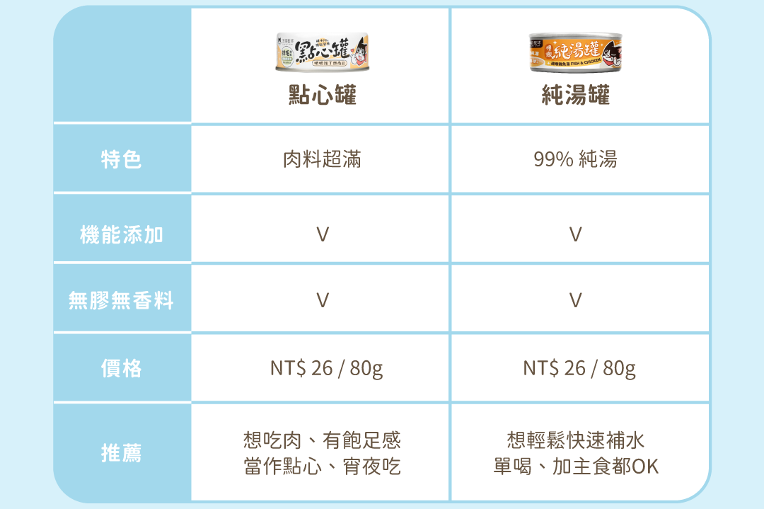 若毛孩平時吃副食罐時,只愛喝湯不喜歡吃肉,或是擔心點心罐中的肉熱量太高、飽足感太高,推薦以純湯罐作為日常補水的副食罐;若毛孩喜歡吃肉、希望給毛孩有飽足感的消夜/獎勵,推薦點心罐當作補水選擇喔!