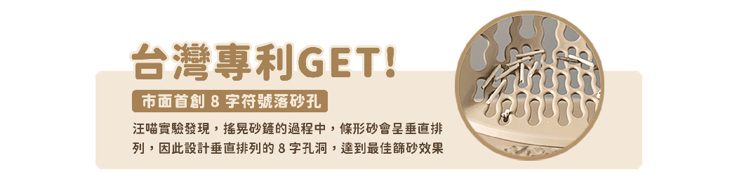 專利 8 字落砂孔設計讓乾淨砂能迅速掉落,