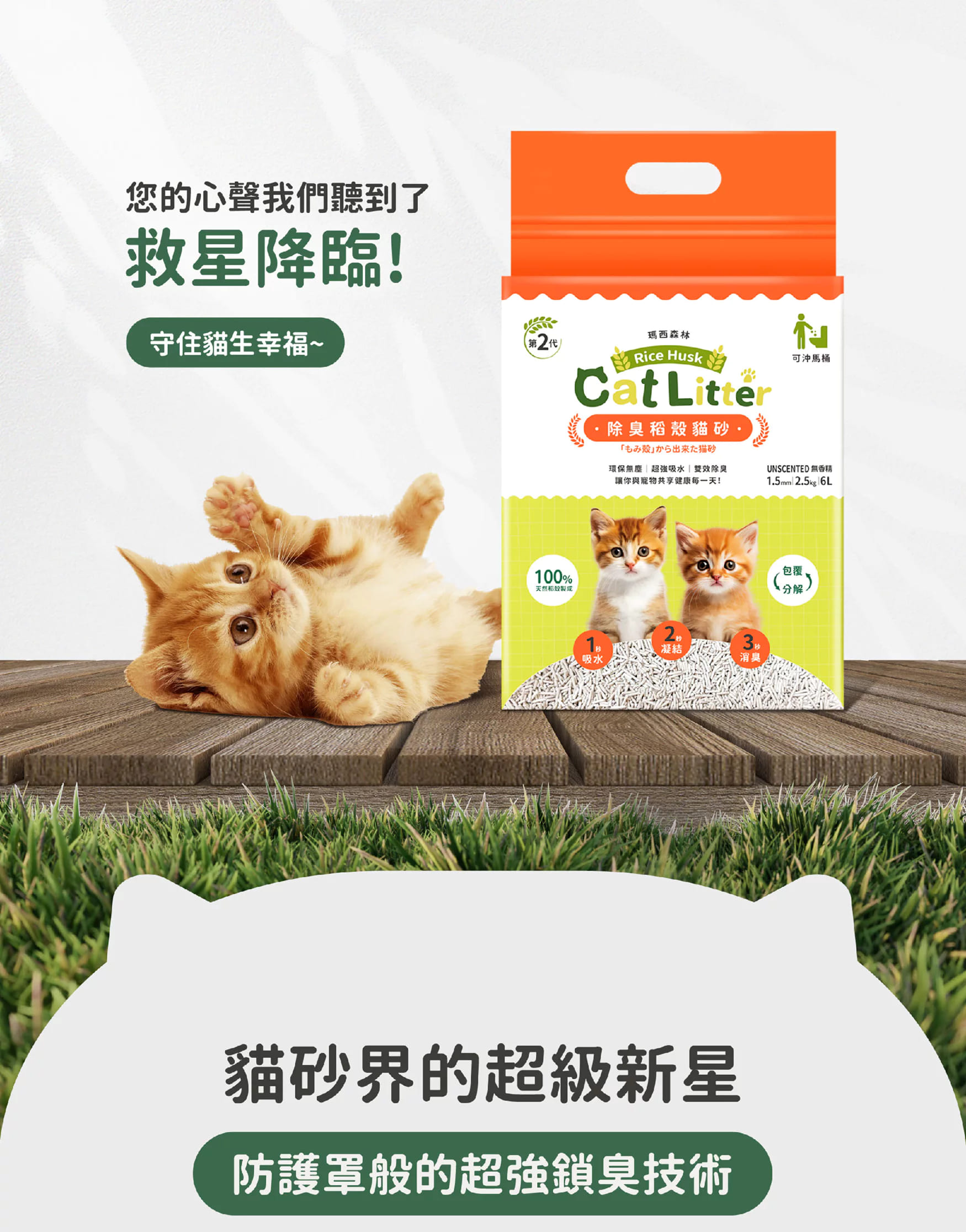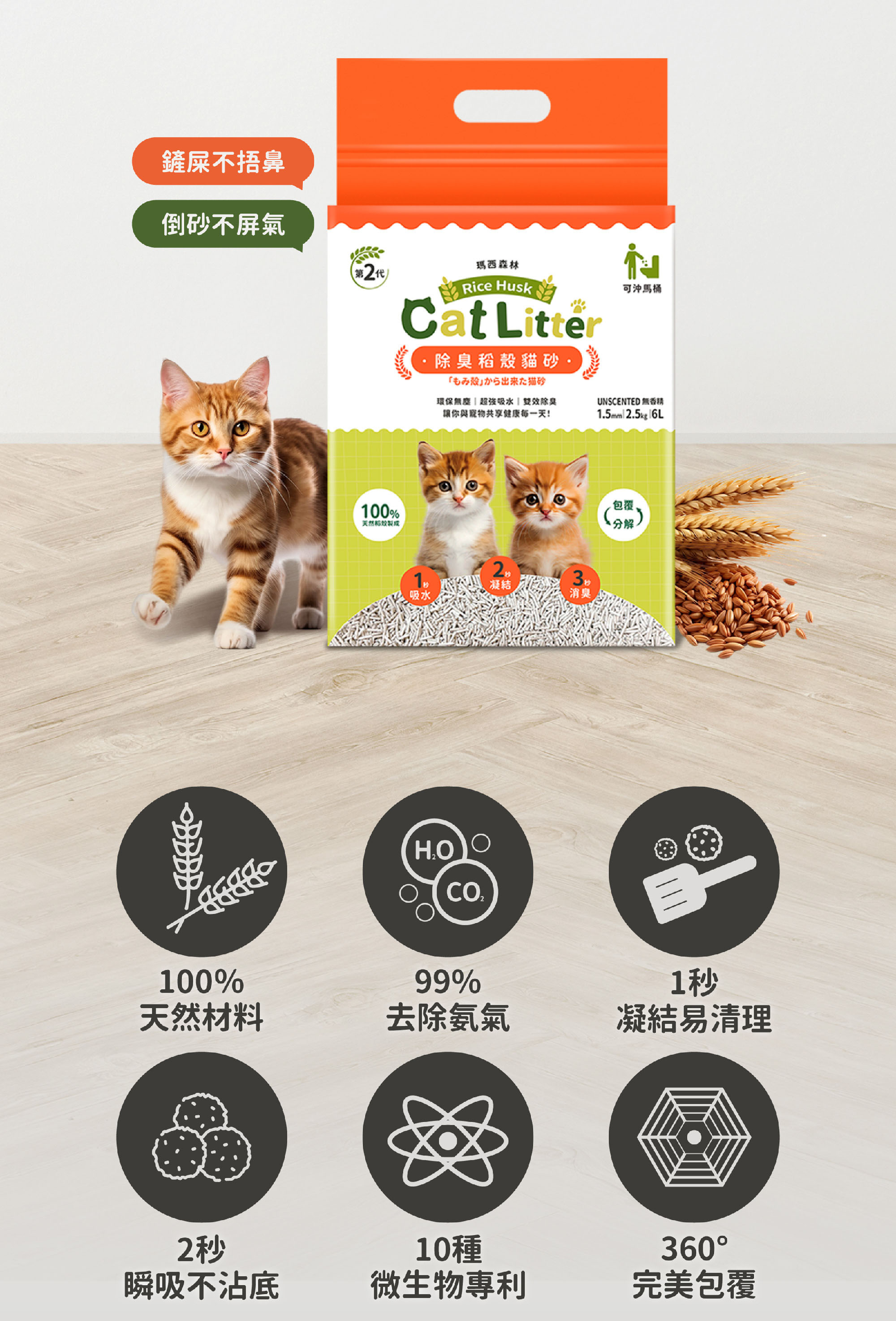 瑪西森林稻殼貓砂,第二代升級配方,貓砂來自於再生農業資源,不添加任何化學物質,純粹天然。