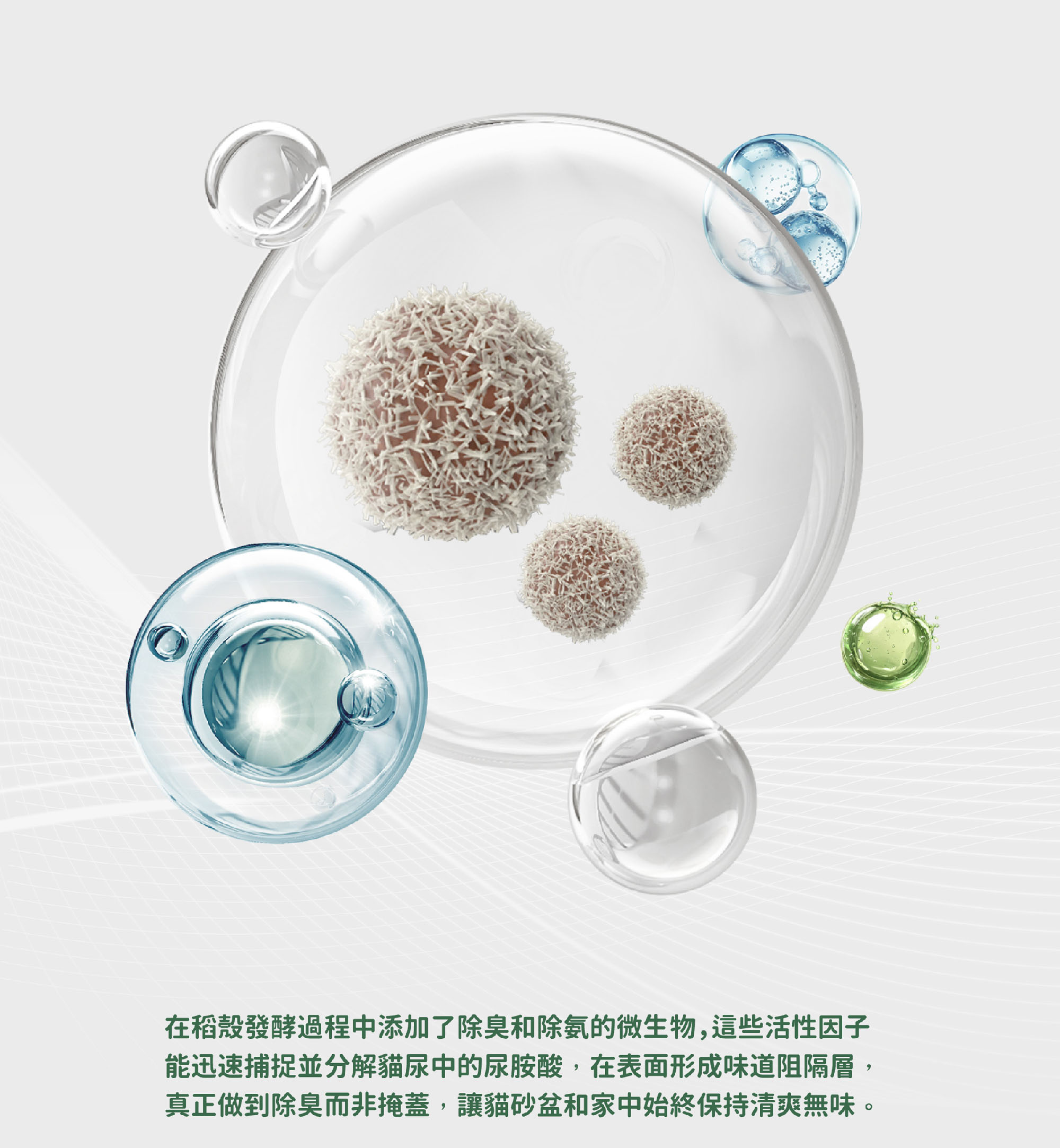 稻殼發酵過程中加入除臭和除氨的微生物,能迅速捕捉猫尿中的尿胺酸臭味,在表面形成味道阻隔,直接分解臭味來源,消除高達99%的異味。