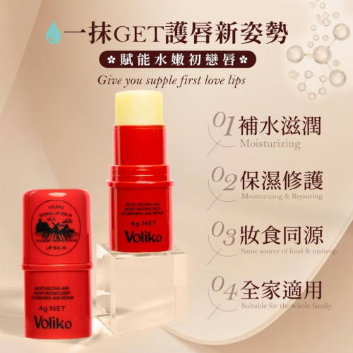 澳洲 VOLIKO木瓜保濕補水潤唇膏 4g 商品功效:補水保濕 防止唇部乾裂 商品重量:4g 使用膚質:所有 保質期:3年(期限2027年)