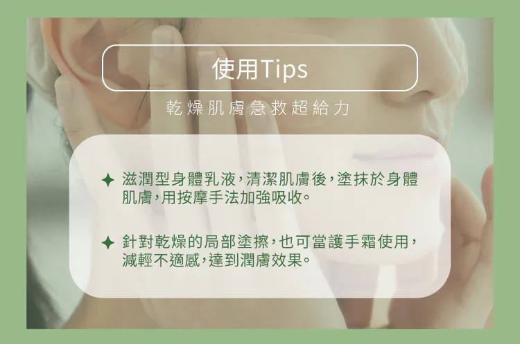 早晚皆可使用,視個人需求使用於局部或全身,塗抹時輕輕做按摩加強吸收。