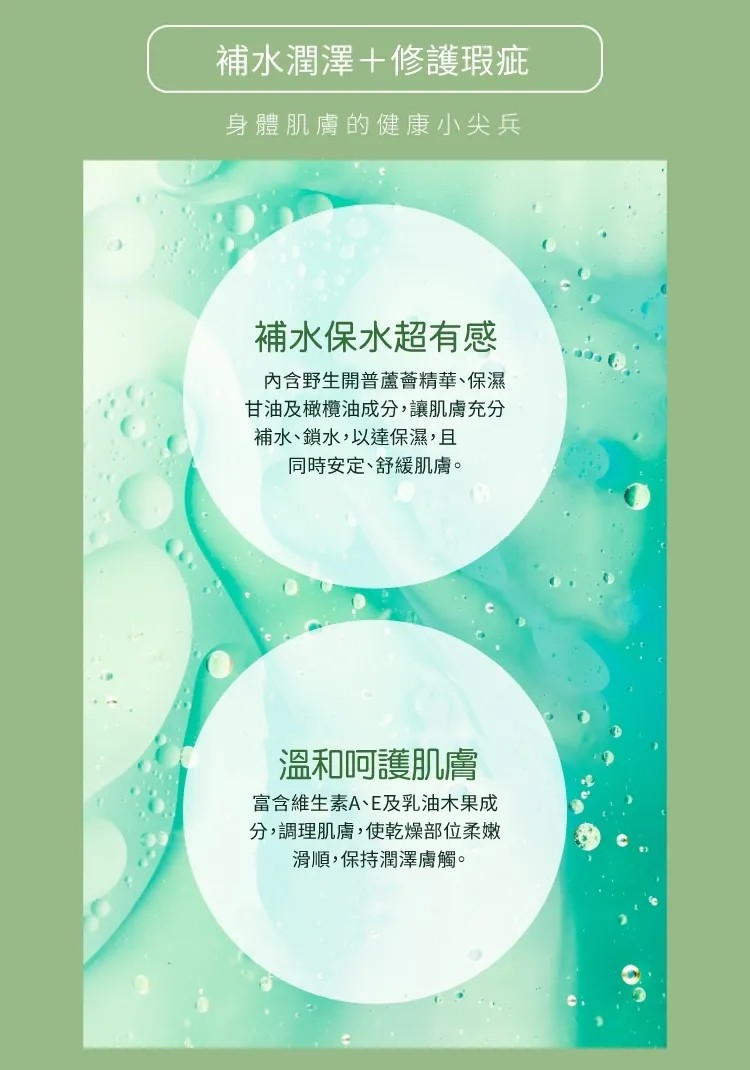針對較粗燥、乾裂部位,如手肘、腳跟等等,提供立即滋潤效果。