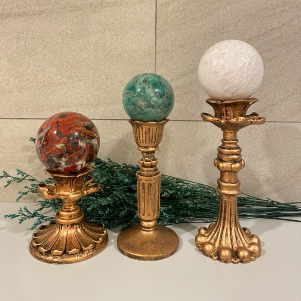 品名 : 水晶球座 尺寸 : 如圖3 材質 : 樹酯 適合礦品尺寸 : 照片由左至右展示礦品尺寸為 6.5 / 5.5 / 6.5 (單位cm),B款_中 不建議擺放大於5.5 cm的球了 * 此賣場商品僅販售球座,🔸圖片中的礦品不販售🔸,如擔心地震掉下來,可用黏土黏底加固喔 ! #水晶球座 #球座 #底座 #燭台 #居家裝飾 #擺件 #攝影道具