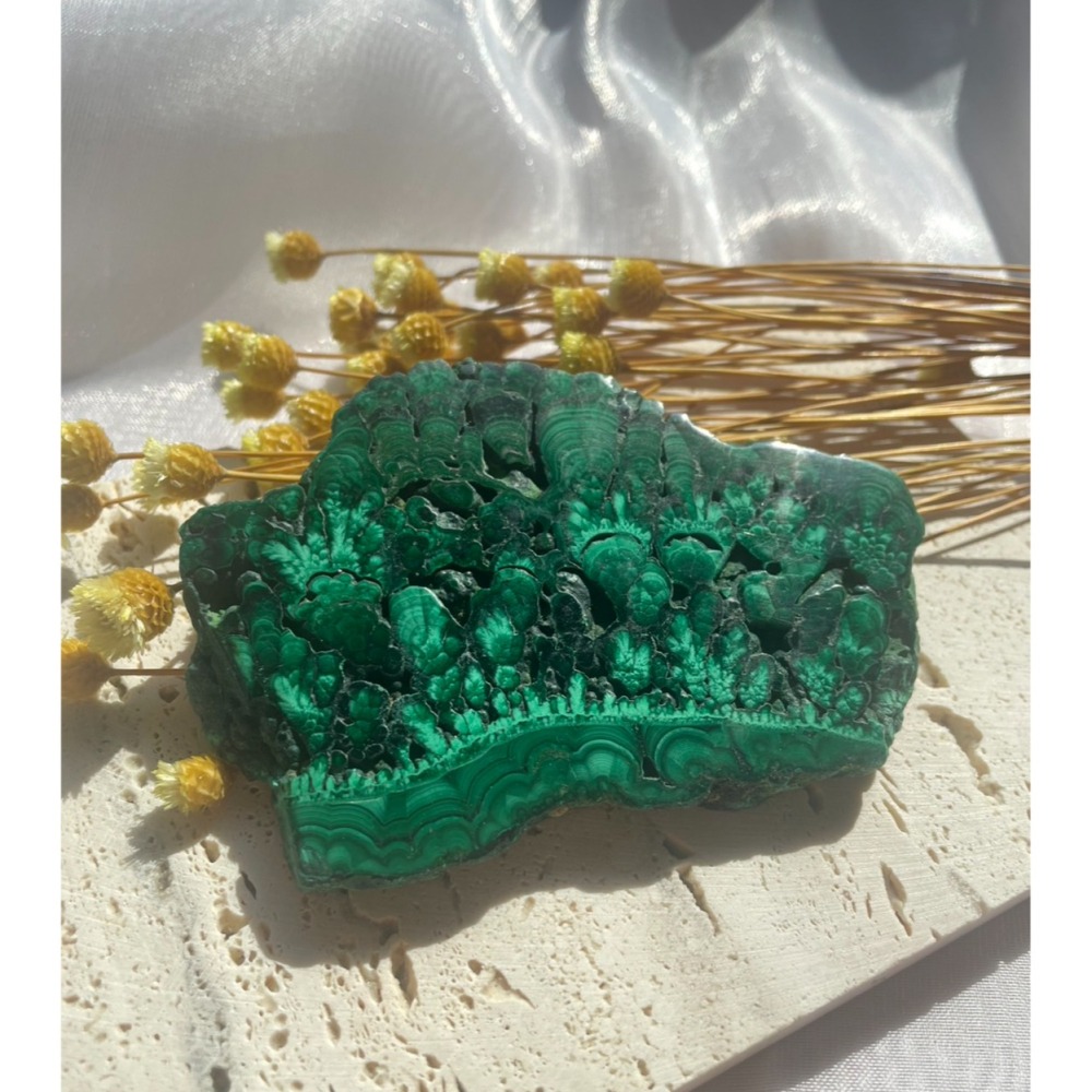 礦體 : 經典孔雀石才有的飽滿綠色,搭配礦洞層次滿滿,細看紋理極其豐富