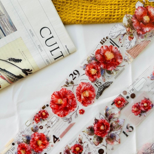 【商品資訊】 商品名稱:小白家 | 復古山茶花大花卉_紅茶_PET 膠帶|分裝 200 cm