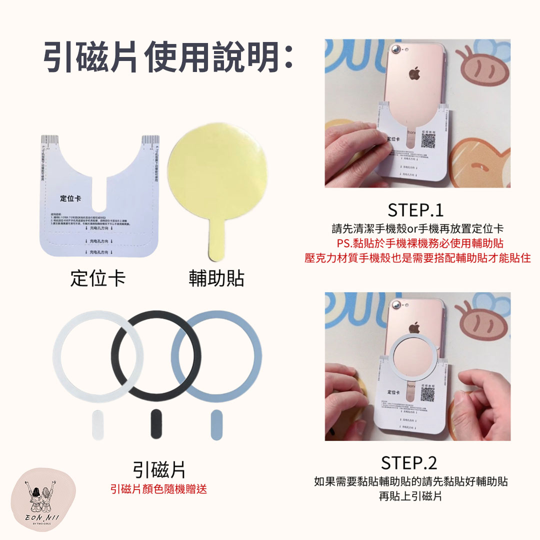 2、iPhone 12(含)以上機型若手機殼影響磁吸效果,建議將引磁片黏在殼上再進行使用呦