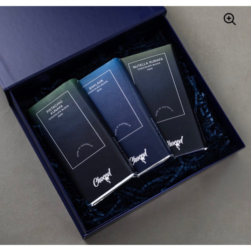 盡享經典三重奏禮盒,Choced 最受歡迎的經典之作:果仁蜜餅巧克力塊、能多益巧克力塊和開心果巧克力塊。每塊巧克力塊均採用 比利時頂級巧克力,並以全球標誌性甜點為靈感,手工打造。