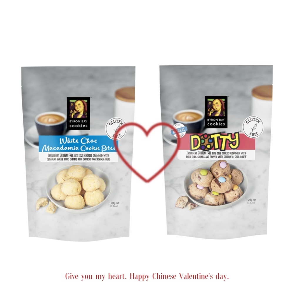 這款Dotty®無麩質曲奇小吃在拜倫灣烘焙至完美,採用拜倫灣曲奇公司 傳承咖啡館曲奇配方精心製作,滿口牛奶巧克力塊和色彩繽紛 的圓點巧克力糖粒,定會令所有曲奇愛好者心滿意足。每一 口都充滿拜倫風味!