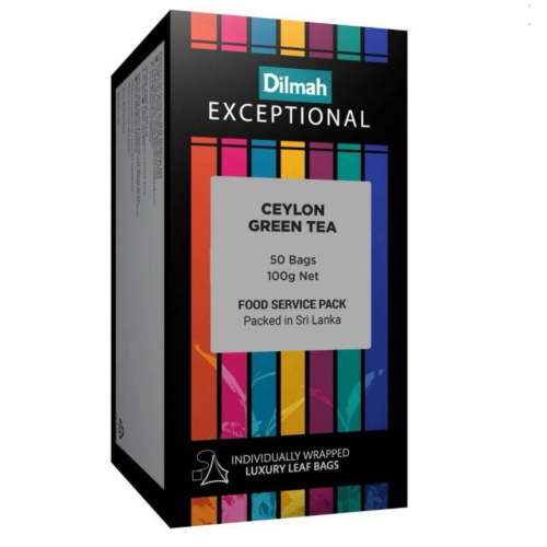 錫蘭綠茶,輕蒸而成,口感微澀,堪稱頂級綠茶的 典範。茶湯呈淡黃色,略帶橄欖光澤。口感細膩怡人,餘韻 微甜。 Dilmah 優質錫蘭綠茶包裝包含 50 個獨立鋁箔包裝的 茶包。