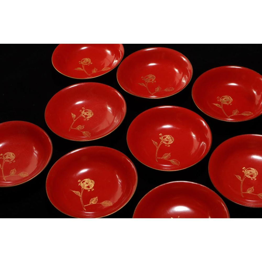 《部町》日本 木胎 沈金花卉朱漆菓子盤 直徑|11CM 高度|3CM 年代|昭和時代 #茶碗 #京都 #抹茶 #日本 #神社 #茶道 #古董 #花藝 #部町 H233