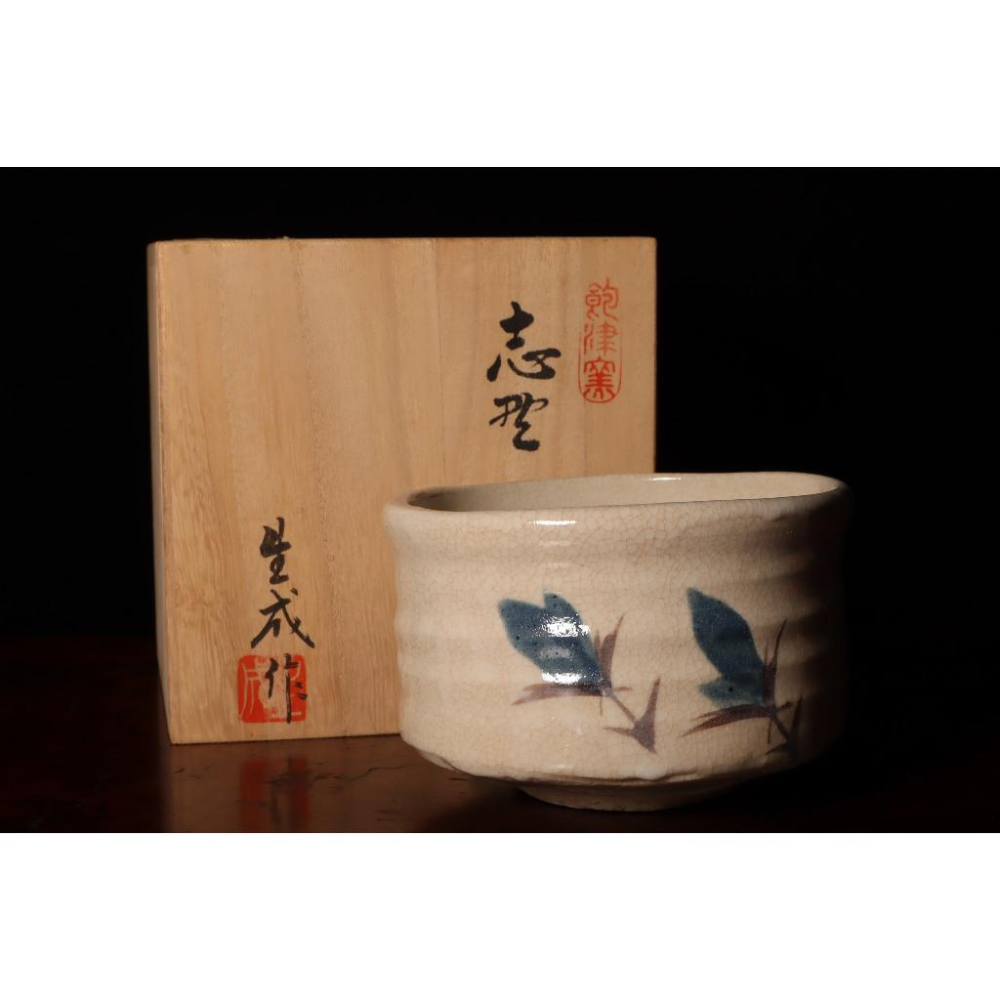 《部町》日本 飽津窯 宮地生成造 繪龍膽 志野抹茶碗 附木箱 原共布|抹茶 茶道具 茶道 花道 花藝 神社 京都 古董