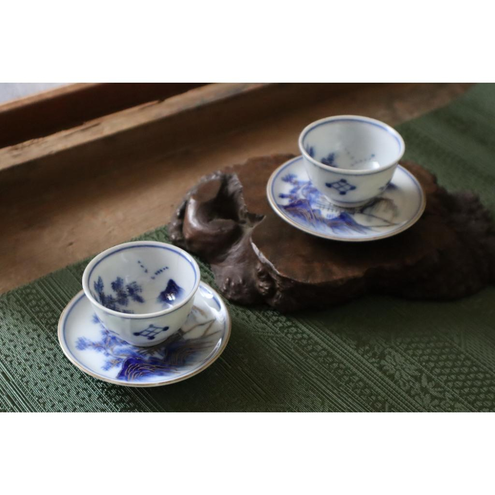 《部町》日本 明治時代 九谷 金彩 染付青花山水紋 茶杯托 一套|抹茶 古董 茶杯 水杯 瓷器 磁器 茶碗 茶葉