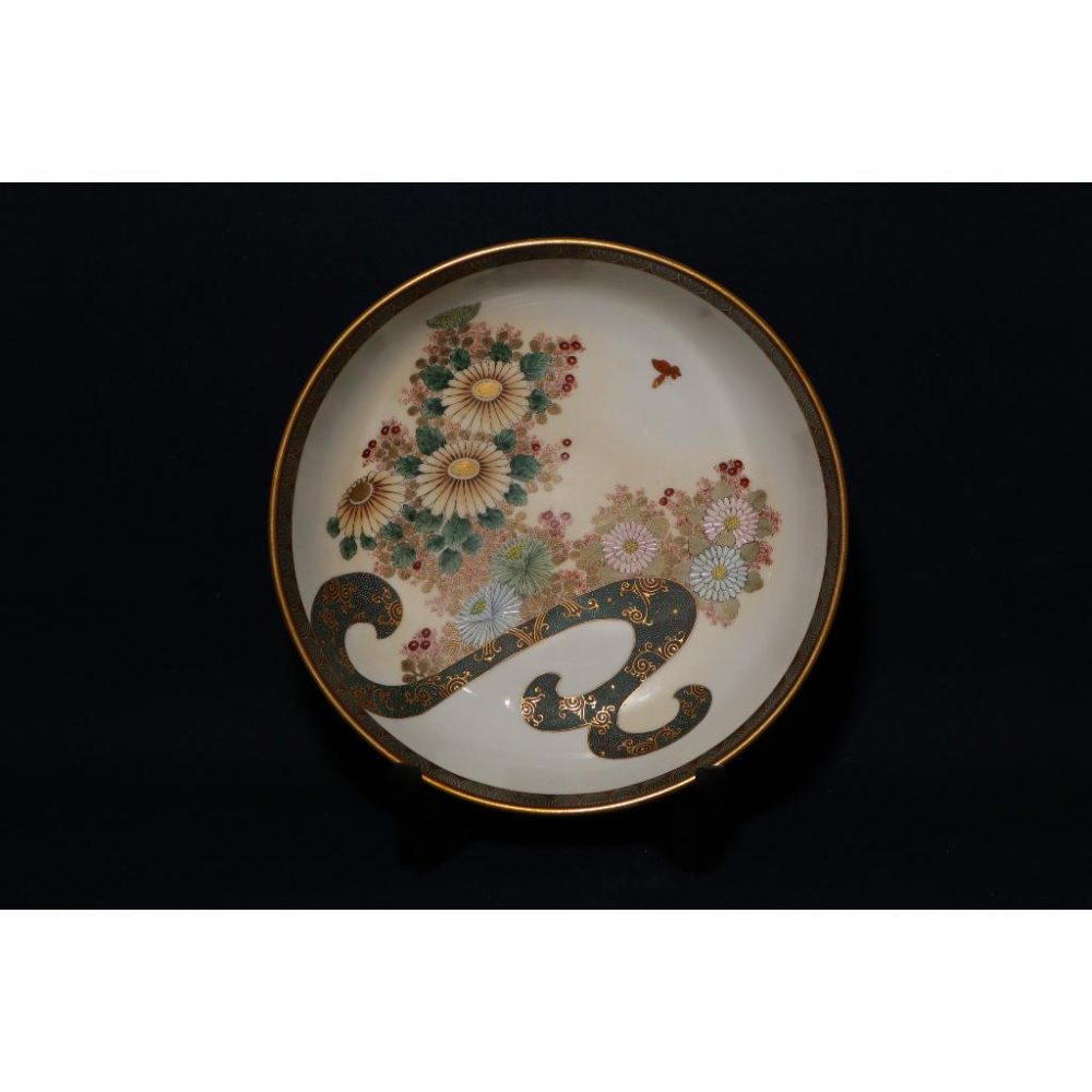 《部町》日本 老九谷 梶本款 手繪青粒秋菊描金菓子缽 大盤 |抹茶 茶道具 茶道 花道 花藝 神社 京都 古董 九谷燒
