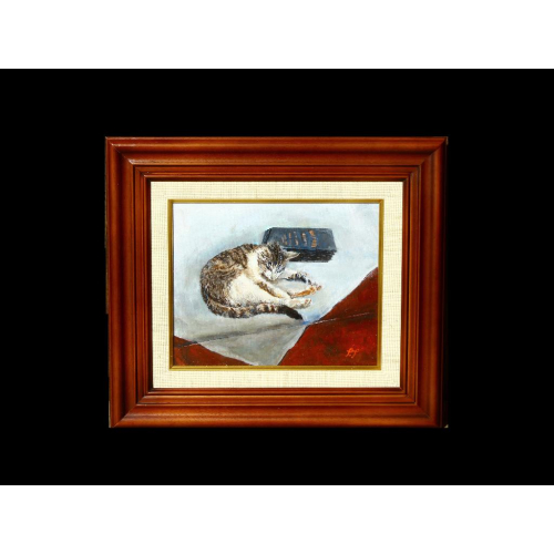 《部町》手繪油畫 虎斑貓憩 木框畫 畫框尺寸 長度|42.5cm 寬度|37cm 畫心尺寸 長度|25.5cm 寬度|20.5cm 年代|2001年 材質|油畫 #墨寶 #文房 #茶道 #花藝 #花道 #禪 #神社 #法師 #宗教 #佛教 #茶掛 #掛軸