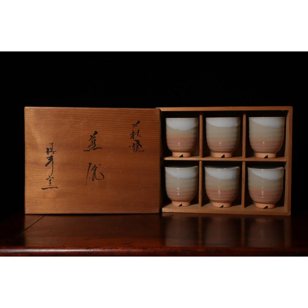 《部町》日本 萩燒椿秀窯 湯吞杯 茶杯 六客 附木箱|抹茶 茶道具 茶道 花道 花藝 神社 京都 古董 茶碗 茶杯