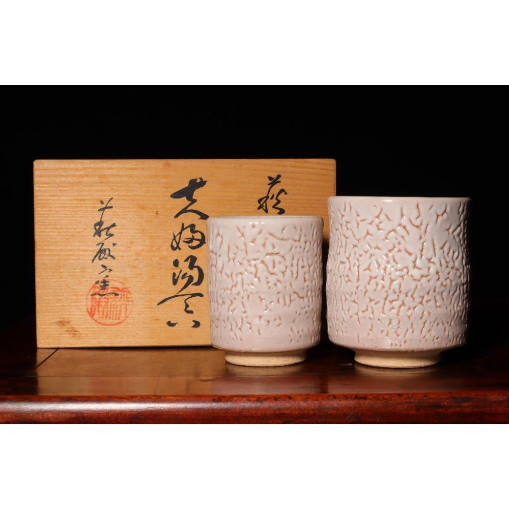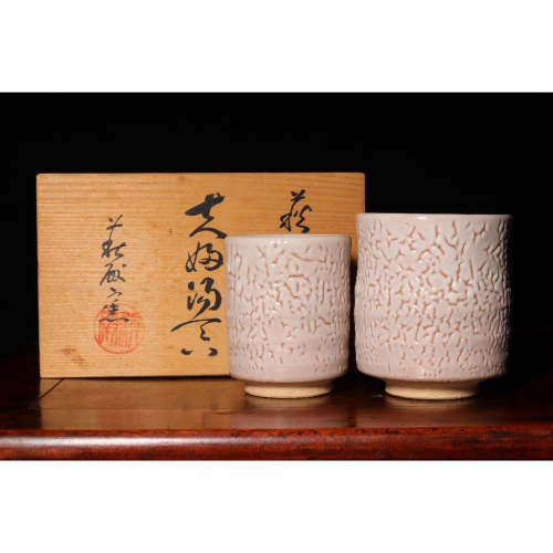 《部町》日本 萩燒 鬼萩 湯吞杯 茶杯一對 附木箱|抹茶 茶道具 茶道 花道 花藝 神社 京都 古董 茶碗 茶杯