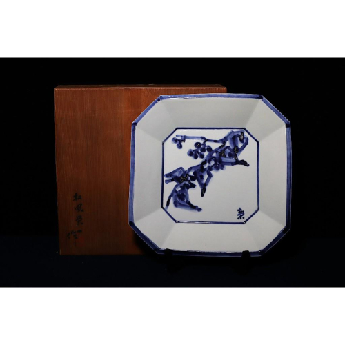 《部町》日本 名家 松風栄一造 染付青花 角盤 附木箱 寬度|30.6CM 高度|4.5CM 年代|昭和時代 #茶碗 #京都 #抹茶 #日本 #神社 #茶道 #古董 #花藝 #部町