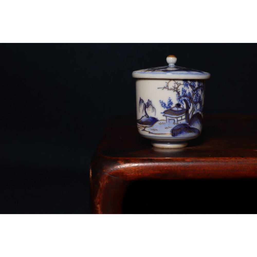 《部町》日本時代物 老九谷 描金山水染付青花 金鑭手蓋湯吞 茶杯 |抹茶 茶道具 茶道 花道 花藝 神社 茶葉 普洱茶