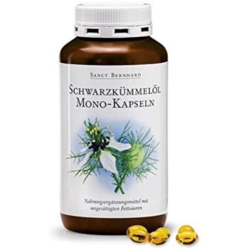 Kräuterhaus Sanct Bernhard Schwarzkümmelöl-Mono-Kapseln 德國🇩🇪百年草本黑籽油單粒膠囊 400 顆 來自真正的黑孜然 (Nigella sativa) 種子的純埃及冷榨油廣為人知,是大自然的珍貴禮 物。其廣泛使用已經 2000 多年了,它的治療效果是全面性的,幾千年來,人們都把它當作靈丹妙藥不是沒有道理的~ 黑種草主要功效:喉嚨發炎﹑第二型糖尿病﹑癲癇發作﹑高血壓﹑真菌感染(治療足部真菌﹑腸道真菌病和陰道酵母菌)﹑癌症﹑虛弱的免疫系統﹑皮膚狀況﹑過敏。 每天服用 3 次,每次 2 粒,並用足量的液體服用