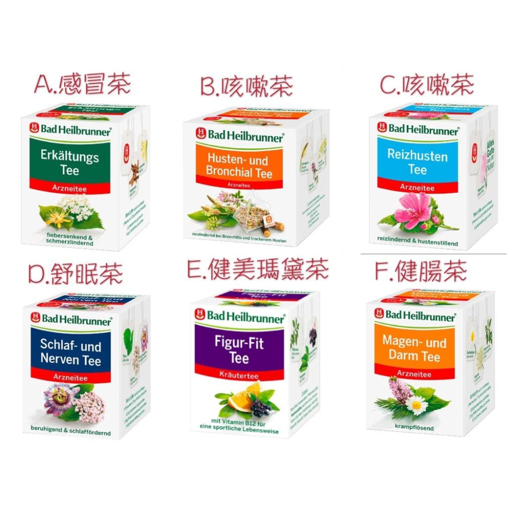 A. Erkältungs Tee - 感冒茶 B. Husten- und Bronchial Tee - 咳嗽支氣管茶 C. Reizhusten Tee - 乾咳茶 D. Schlaf- und Nerven Tee - 舒眠 E. Figur-Fit Tee - 健美瑪黛茶 F. Magen- und Darm Tee - 健腸茶 沖泡方式: 使用沸騰的150ml熱水沖泡茶包,放置10-15分鐘的時間再把茶包取出,熱熱喝效果更佳。