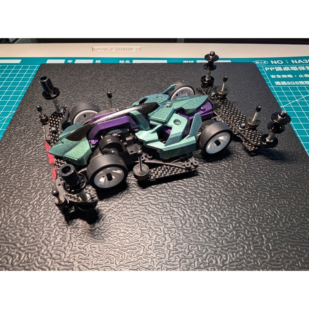 車子外觀如照片所示,前後都設定13mm導輪,並且使搭配碳纖維弓翼前2片後1片,,可以讓車子更快速過彎,沒有跟風去追求加大重量可能破規的吊鐘設定,因為目前規則還是太不確定了,在日本官方還沒有推出設定雜誌下,不建議更風,畢竟目前台灣多數比賽還沒看到有前吊中有贏過大賽。