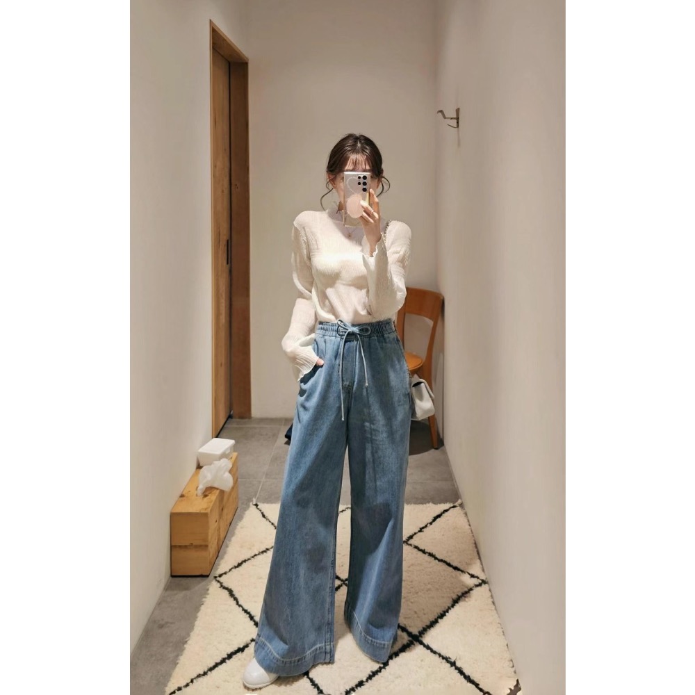 闊腿寬版修飾腿長,混天絲材質的丹寧垂感超級漂亮,帶一點低飽和的水洗藍很好搭配,高級鬆弛感拿捏!!