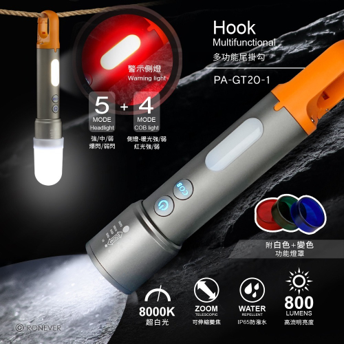 • 四段側燈COB可切換,暖強光/弱光/紅光強/紅光閃SOS。