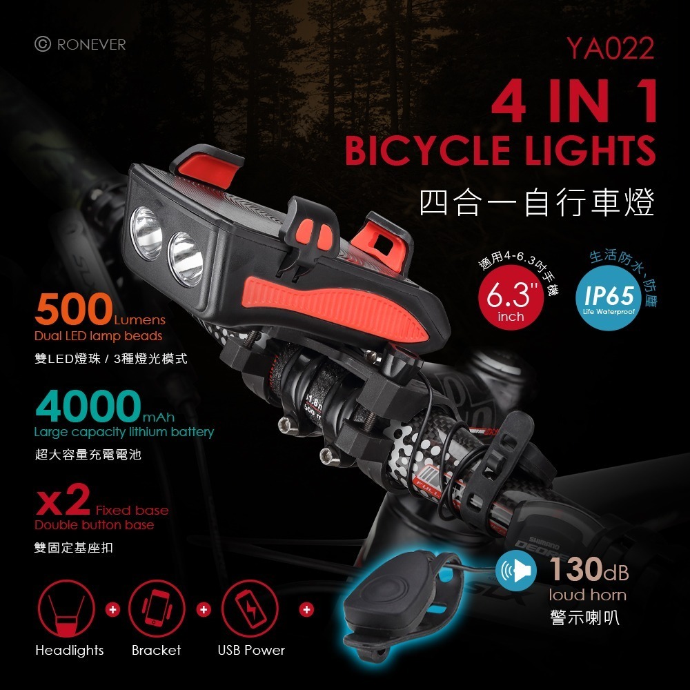 • 四合一多功能,手電筒/手機支架/警示喇叭等功能。