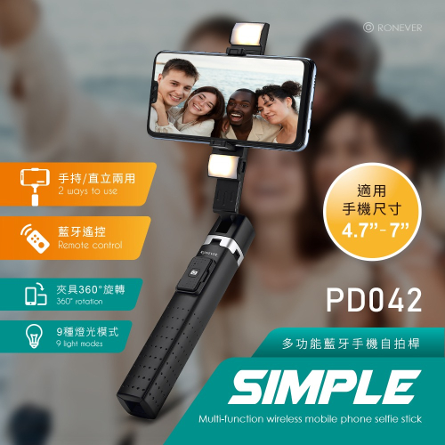 • 自拍桿可手持、直立落地,解放雙手不受限。