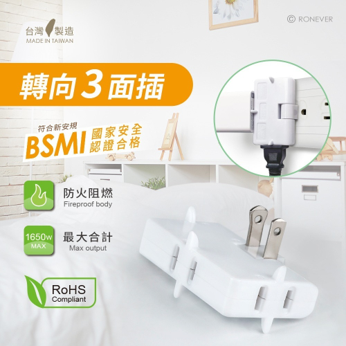 • 可轉向三面插頭,可與牆貼平,節省空間不易勾到或撞到,方便又安全。