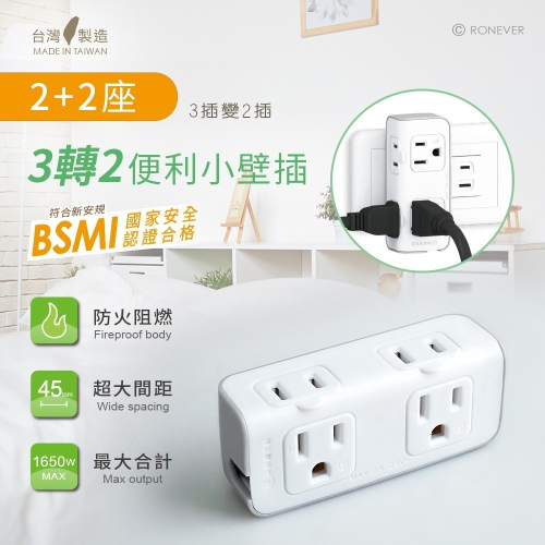 • 2+2多孔折角式插座設計,節省空間、美觀又實用!插座中心間距達45mm,大間距可解決大型插頭多佔