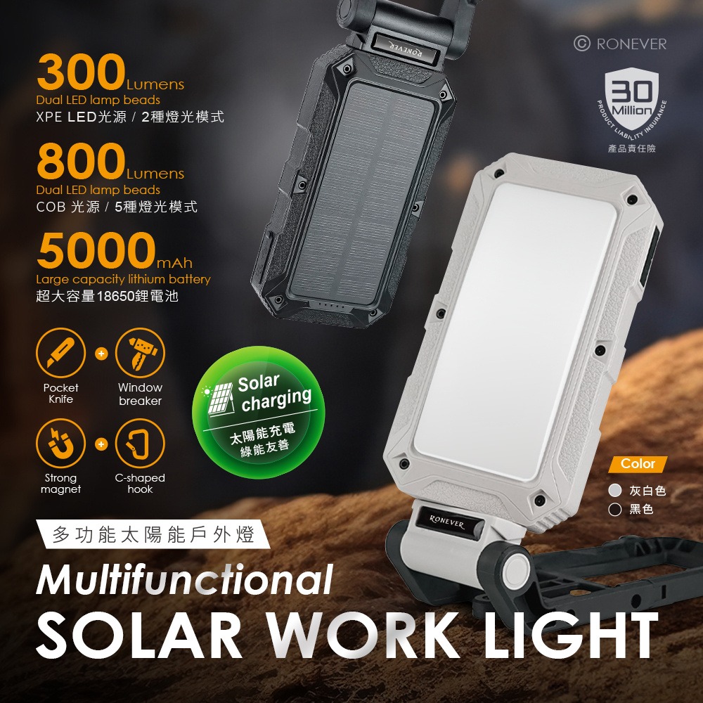 • 側燈800流明強光,適合露營懸掛在帳篷內部,或搭配三腳架設置於戶外。