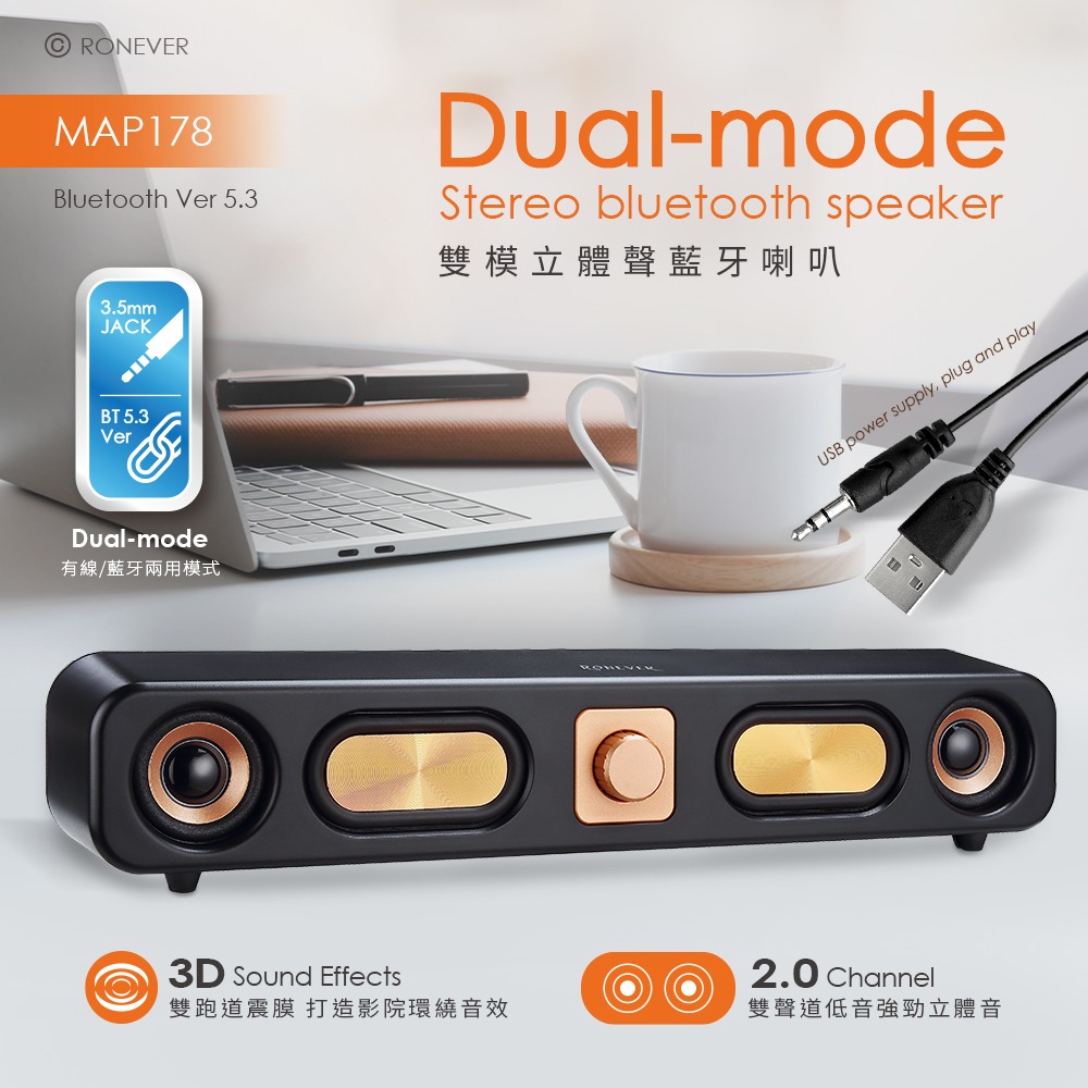 • 兩用設計,可連接藍牙或插入音訊,適用多種設備。