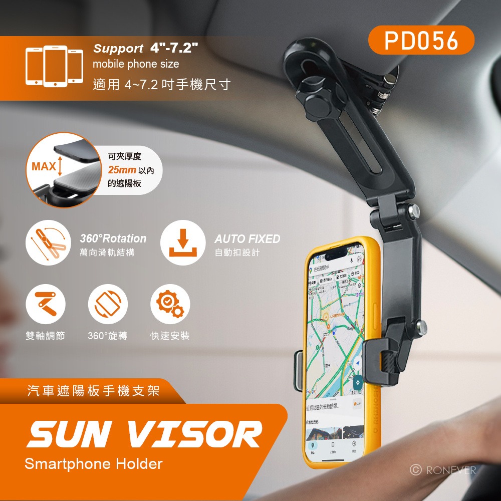 • 支架帶矽膠止滑墊可抗震、防滑,不傷遮陽板、手機,行車更安全。