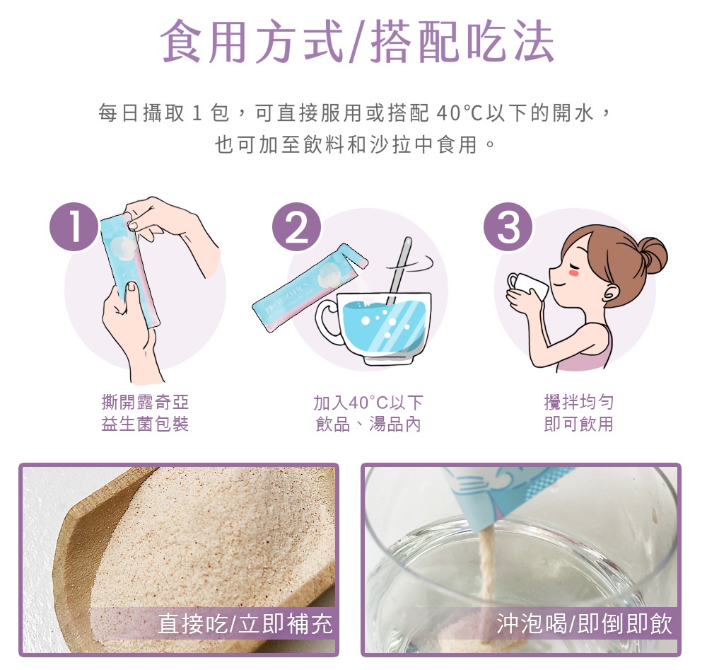 1. 建議搭配40度以下溫冷水食用。若吃了抗生素、咖啡、茶等食品,需間隔1小時再吃
