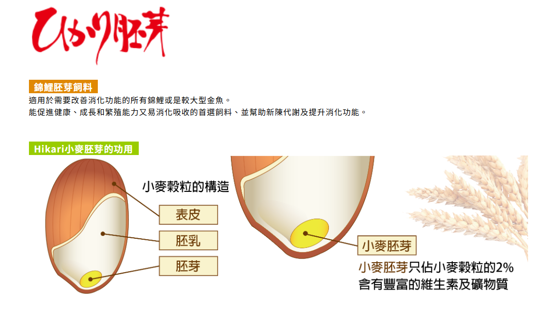 ● Hikari獨家研發,內含高比例易消化吸收的小麥胚芽。設定為春天的飼料,低水溫時也能安心餵食。
