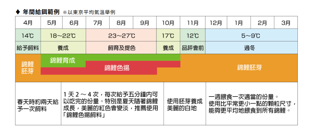 ►在氣溫變化、低溫時期,建議以易消化的高夠力錦鯉胚芽飼料來餵食。