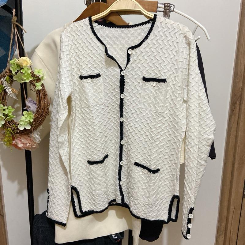 |針織開衫|小香風名媛溫柔日系黑邊奶油白色針織長袖開衫 口袋設計開襟外套精緻刺繡設計 春夏必備 氣質顯瘦 約會職場穿搭
