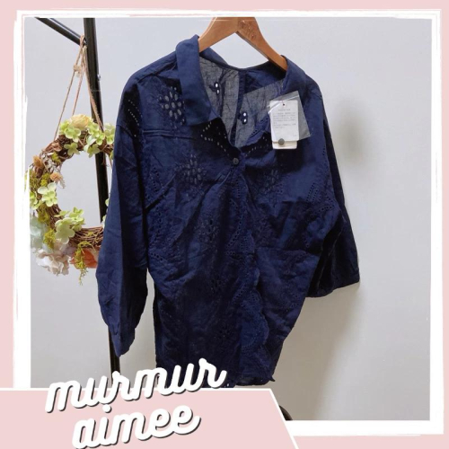 |上衣|日本日牌 Grove 氣質藏藍色刺繡鏤空短袖蕾絲棉襯衫 七分袖長袖上衣 精緻縷空鏤空開衫外搭渡假 休閒辦公室工作