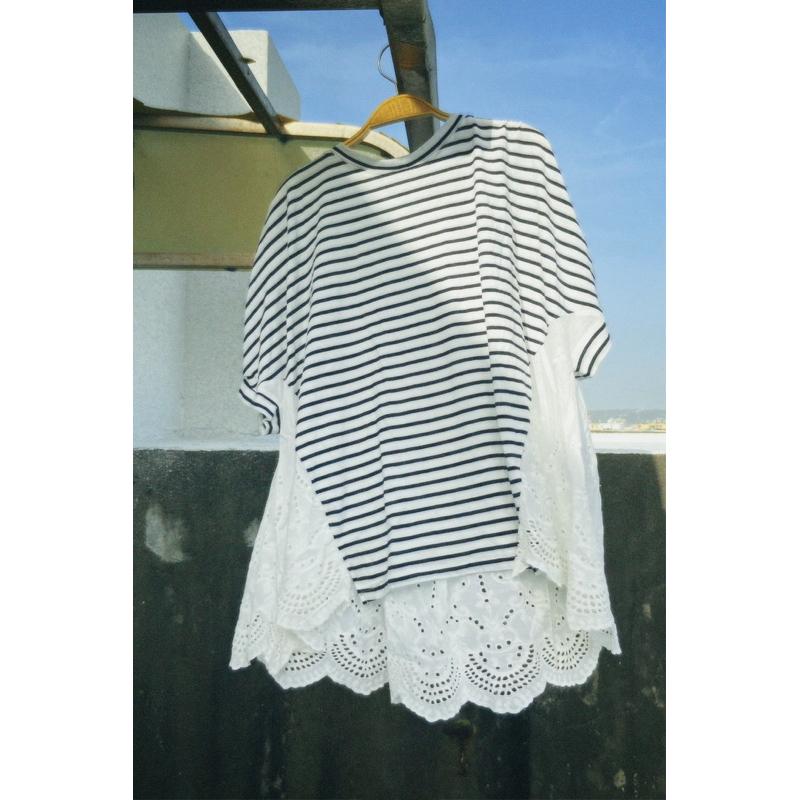 ✓ 商品狀況  ▸ 二手良品 穿一次 ✓ 設計亮點  ▸ 藍白條紋拼接蕾絲  ▸ 刺繡縷空細節  ▸ 寬鬆不挑身材剪裁  ▸ 全棉蕾絲拼接 ✓ 尺寸細節  ▸ 日碼F碼  ▸ 建議參考平量尺寸  |材質|  主布:65%聚酯纖維 35%棉  蕾絲:100%棉  |尺寸|  胸126 長60-72cm ✓ 穿搭建議  ▸ 休閒:搭配牛仔短褲  ▸ 優雅:配A字長裙  ▸ 職場:外搭西裝外套  *二手品難免使用痕跡,每人對新舊程度認定不同, 完美主義者請勿購買避免事後爭議*