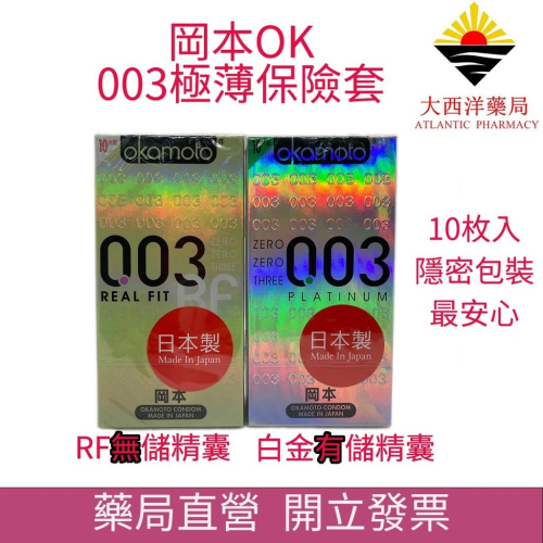 品名:Okamoto岡本衛生套-003白金、003RF貼身 規格:10入裝 闊度:52±2mm 顏色:乳膠原色 保存期限:5年 貨源:公司貨 產地:日本 醫療器材許可證品名:""岡本""衛生套 ""Okamoto""Condom 醫療器材許可證字號:衛署醫器輸字第011828號、衛署醫器輸字第017656號、 衛署醫器輸字第020706號、衛部醫器輸字第031838號 製造廠名稱:OKAMOTO INDUSTRIES, INC., IBARAKIPLANT 製造廠地址:1 NISHIYAMA, ITABASHI-CHO,RYUGASAKI, IBARAKI - PREF., JAPAN 藥局許可執照所載藥局名稱:大西洋藥局 藥局地址:臺中市北區北平路二段28號1樓 藥局許可執照字號:中市藥局字第5903260930號 食品業者登錄字號:B-200201681-00000-8 藥局諮詢專線:04-22932469 營業時間:週一至週六 10:00-23:00 備注: 所有商品皆有完善的售後服務,購買前的任何疑問,或購買後的任何問題,都歡迎私訊, 我們提供最專業的諮詢服務,幫您解答任何問題,或依照您的情況需求,幫您挑選搭配真正適合您的產品。