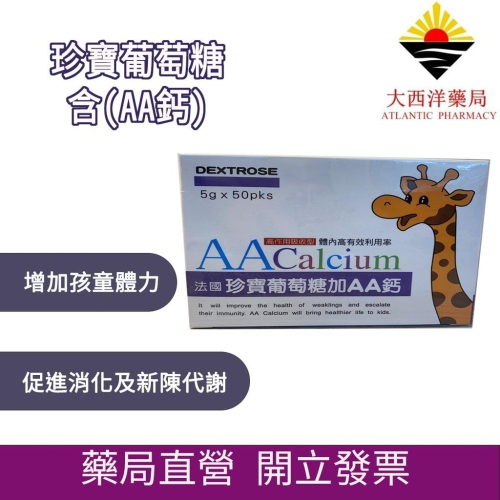品名:珍寶葡萄糖(含AA鈣) 內容量:5公克X50包 成分:每包5公克含有    葡萄糖.....99.4%    碳酸鈣(AA鈣)..0.6% 用法:每包沖泡於100c.c之開水或牛奶,可酌量增減。 批號及有效日期(西元年/月/日):如標示 有效期限:四年 原產地:台灣 藥商:杏懋實業股份有限公司 地址:臺北市松山區南京東路四段143號6樓 TEL:(02)2713-1697 可使孩童增加體力,促進消化及新陳代謝,讓孩童更加健康、活潑、是孩童最佳營養補給品。 藥局許可執照所載藥局名稱:大西洋藥局 藥局地址:臺中市北區北平路二段28號1樓 藥局許可執照字號:中市藥局字第5903260930號 食品業者登錄字號:B-200201681-00000-8 藥局諮詢專線:04-22932469 營業時間:週一至週六 10:00-23:00 備注: 所有商品皆有完善的售後服務,購買前的任何疑問,或購買後的任何問題,都歡迎私訊, 我們提供最專業的諮詢服務,幫您解答任何問題,或依照您的情況需求,幫您挑選搭配真正適合您的產品。