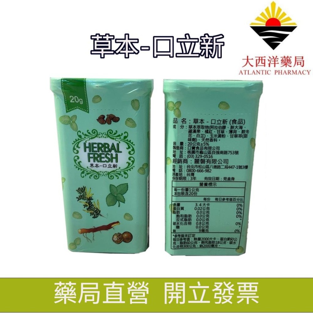品名:草本-口立新(食品) 成分:草本萃取物(阿拉伯膠、胖大海、羅漢果、橘紅、甘草、薄荷、款冬花、白芷)、玉米澱粉、甘草萃(甜味劑)、天然香料。 容量:20公克 ± 5% 製造商:口寶食品有限公司 地址:桃園市龜山區自強南路753號 電話:(03)329-0516 經銷商:麗磐有限公司 地址:台北市松山區八德路二段447-1號3樓 電話:0800-666-982 原產地:台灣 保存期限:3年 有效日期:見盒身 藥局許可執照所載藥局名稱:大西洋藥局 藥局地址:臺中市北區北平路二段28號1樓 藥局許可執照字號:中市藥局字第5903260930號 食品業者登錄字號:B-200201681-00000-8 藥局諮詢專線:04-22932469 營業時間:週一至週六 10:00-23:00 備注: 所有商品皆有完善的售後服務,購買前的任何疑問,或購買後的任何問題,都歡迎私訊, 我們提供最專業的諮詢服務,幫您解答任何問題,或依照您的情況需求,幫您挑選搭配真正適合您的產品。