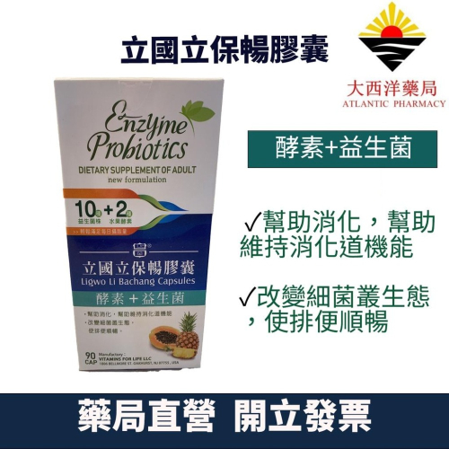品名:立國立保暢膠囊 成分:低聚果糖、鳳梨酵素、木瓜酵素、 嗜熱鏈球菌、胚芽乳酸菌、嗜酸乳桿菌、 長雙歧桿菌、雷特氏雙歧桿菌、乾酪乳桿菌、 鼠李糖乳桿菌、副乾酪乳桿菌、加氏乳桿菌、 唾液乳桿菌、啤酒酵母。 膠囊成分:明膠、甘油、二氧化鈦、乳糖 用法用量:每日食用1粒,多食無益。 (一日請勿超過1粒)(多食無益)。 容 量:90粒瓶装。 原產國:美國。 儲存方法:置於低溫乾燥處,避免陽光照射。 過敏原:本產品含牛奶類及大豆製品過敏體質、有免疫相關疾病者,請謹慎食用並先詢醫師意見。 藥局許可執照所載藥局名稱:大西洋藥局 藥局地址:臺中市北區北平路二段28號1樓 藥局許可執照字號:中市藥局字第5903260930號 食品業者登錄字號:B-200201681-00000-8 藥局諮詢專線:04-22932469 營業時間:週一至週六 10:00-23:00 備注: 所有商品皆有完善的售後服務,購買前的任何疑問,或購買後的任何問題,都歡迎私訊, 我們提供最專業的諮詢服務,幫您解答任何問題,或依照您的情況需求,幫您挑選搭配真正適合您的產品。