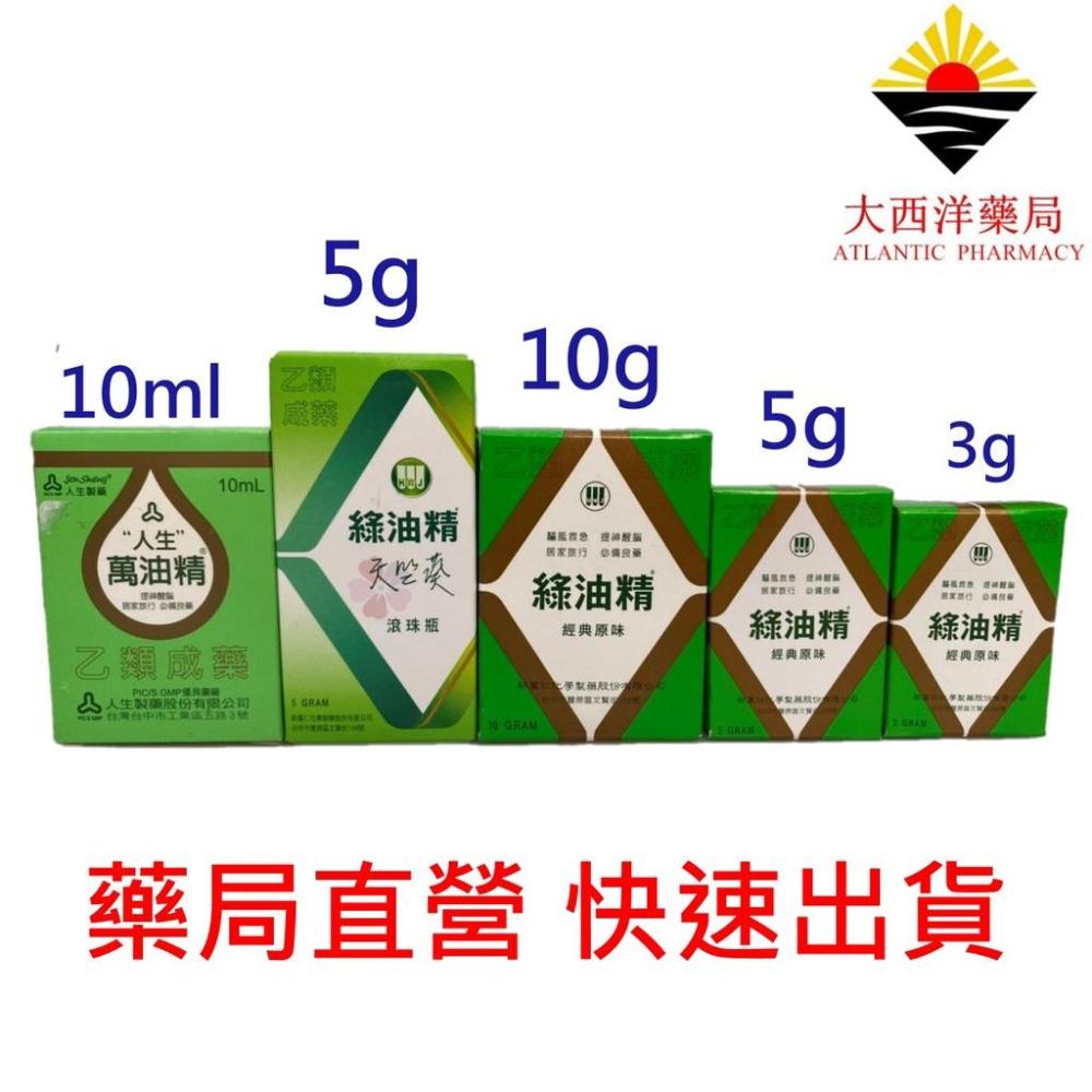藥品資訊 藥品品名:綠油精Green Oil 用途適應症:頭眩鼻塞、肚痛、頭痛、小兒腹痛、胸肩不舒、蚊蟲咬傷、湯火灼傷、止癢消腫、手足痠痛、肌肉痠痛、暈船、暈車 不得使用族群:曾因本藥成分引起過敏的人 藥品許可證核准字號:內衛成製字第001347號 消費者服務專線:0800-228080 ��品名:綠油精Green Oil天竺葵滾珠瓶5g 醫療藥品許可證所載製造廠名稱: 新萬仁化學製藥股份有限公司 製造廠地址:台中市豐原區文賢街158號 消費者使用前應詳閱產品說明書 製造日期:請見產品外包裝 有效期間(或保存期限):5年�規格:5g 原產地:台灣 保存環境:室溫 藥品許可證核准字號:內衛成製字第001347號 製造商名稱:新萬仁化學製藥股份有 製造商電話:04-25269105 製造商地址:台中市豐原區文賢街158號 �� 商品簡述:綠油精馬鞭草滾珠瓶 規格:5g 原產地:台灣 保存環境:室溫 藥品許可證核准字號:內衛成製字 第001347號 藥品成份:每公克含有Menthol 310mg, Methyl Salicylate 200mg, Camphor 30mg 藥品適應症:頭眩鼻塞,肚痛,頭痛,小兒腹痛,胸肩不舒,蚊蟲咬傷,湯火灼傷,止癢消腫,暈車 有效期限:三年 藥品標籤、仿單、包裝所載明之副作用、禁忌或其他注意事項:有下列情形者,請勿使用:曾因本藥成分引起過敏的人。 品名:人生 萬油精 許可證核准字號:衛署成製字第012622號 適應症:頭眩、鼻塞、頭痛、蚊蟲咬傷、湯火灼傷、止癢消腫、手足酸痛、舟車暈浪。 藥商名稱:人生製藥股份有限公司 製造廠名稱:人生製藥股份有限公司 製造廠地址:台中市西屯區工業區五路3號 禁忌或其他注意事項:有下列情形者,請勿使用:曾因本藥成分引起過敏的人。 使用方式:外用,每日數次塗抹於患處。 藥局許可執照所載藥局名稱:大西洋藥局 藥局地址:臺中市北區北平路二段28號1樓 藥局許可執照字號:中市藥局字第5903260930號 食品業者登錄字號:B-200201681-00000-8 藥局諮詢專線:04-22932469 營業時間:週一至週六 10:00-23:00 備注: 所有商品皆有完善的售後服務,購買前的任何疑問,或購買後的任何問題,都歡迎私訊, 我們提供最專業的諮詢服務,幫您解答任何問題,或依照您的情況需求,幫您挑選搭配真正適合您的產品。