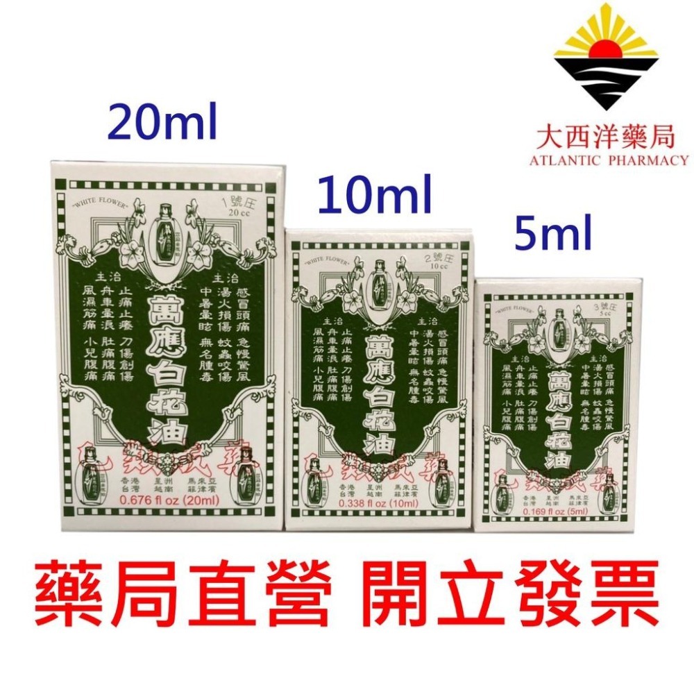 *** 衛署成製字第006856號 *** 中文品名:萬應白花油 英文品名:THE WHITE FLOWER EMBROCATION(PAK FAH YEOW) 適應症:感冒頭痛、中暑暈眩、舟車暈浪、急慢驚風、無名腫毒、肚痛腹痛、蚊蟲咬傷、止痛止癢、風濕筋痛、湯火損傷、刀傷創傷、小兒腹痛。 藥品類別:乙類成藥 主成分略述:薄荷腦、冬青油、桉葉油、樟腦、薰衣草油 藥商名稱: 白花油國際有限公司 藥品製造廠名稱:天乾製藥有限公司/白花油國際股份有限公司 藥品製造廠地址: 臺南市將軍區忠興里忠興132之35號/臺南市佳里區延平路351號6樓之2 藥局許可執照所載藥局名稱:大西洋藥局 藥局地址:臺中市北區北平路二段28號1樓 藥局許可執照字號:中市藥局字第5903260930號 食品業者登錄字號:B-200201681-00000-8 藥局諮詢專線:04-22932469 營業時間:週一至週六 10:00-23:00 備注: 所有商品皆有完善的售後服務,購買前的任何疑問,或購買後的任何問題,都歡迎私訊, 我們提供最專業的諮詢服務,幫您解答任何問題,或依照您的情況需求,幫您挑選搭配真正適合您的產品。