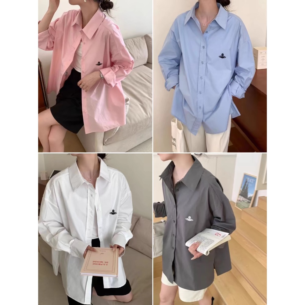 Vivienne Westwood 襯衫 偽洋裝 防曬防風外套 經典土星~ 穿搭利落 超級顯瘦 四季皆宜 永不退流行基本款 簡約刺繡logo翻領純色單排扣休閒襯衫