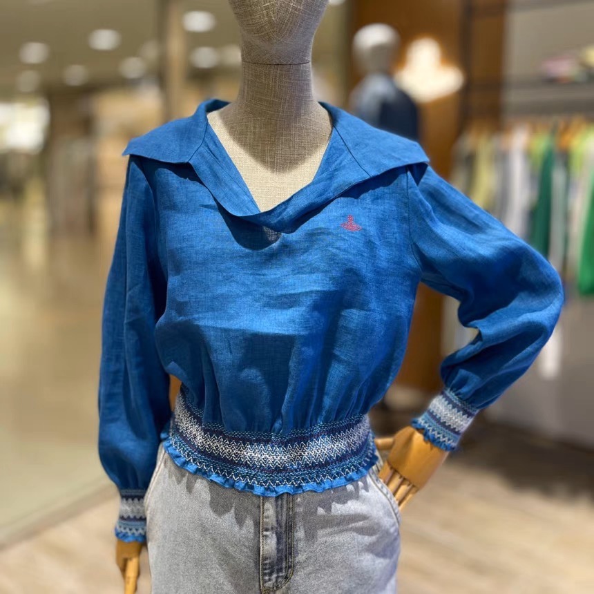Vivienne Westwood 襯衫 上衣 土星繡花白色兜領苧麻襯衫 長袖翻領寬松套頭 淸新好氣質