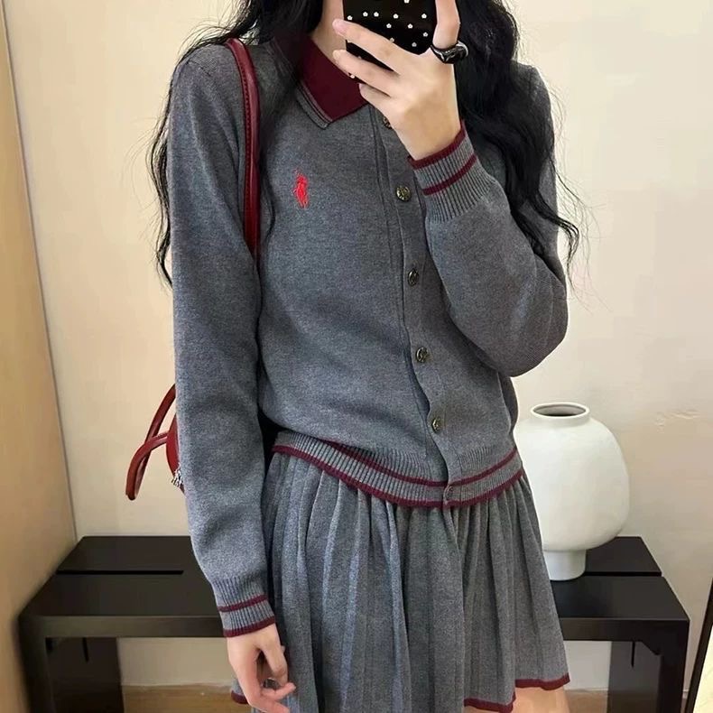 RL polo 針織套裝 小外套 短裙 針織上衣外套 裙子 百摺裙 休閒顯瘦拉長身形!清爽有氣質撞色翻領針織開衫+百褶半裙 百分百羊毛針織 質感細膩軟糯 經典減齡單品 立體Logo字母胸針裝飾 版型不挑人 巨顯瘦 清爽有氣質